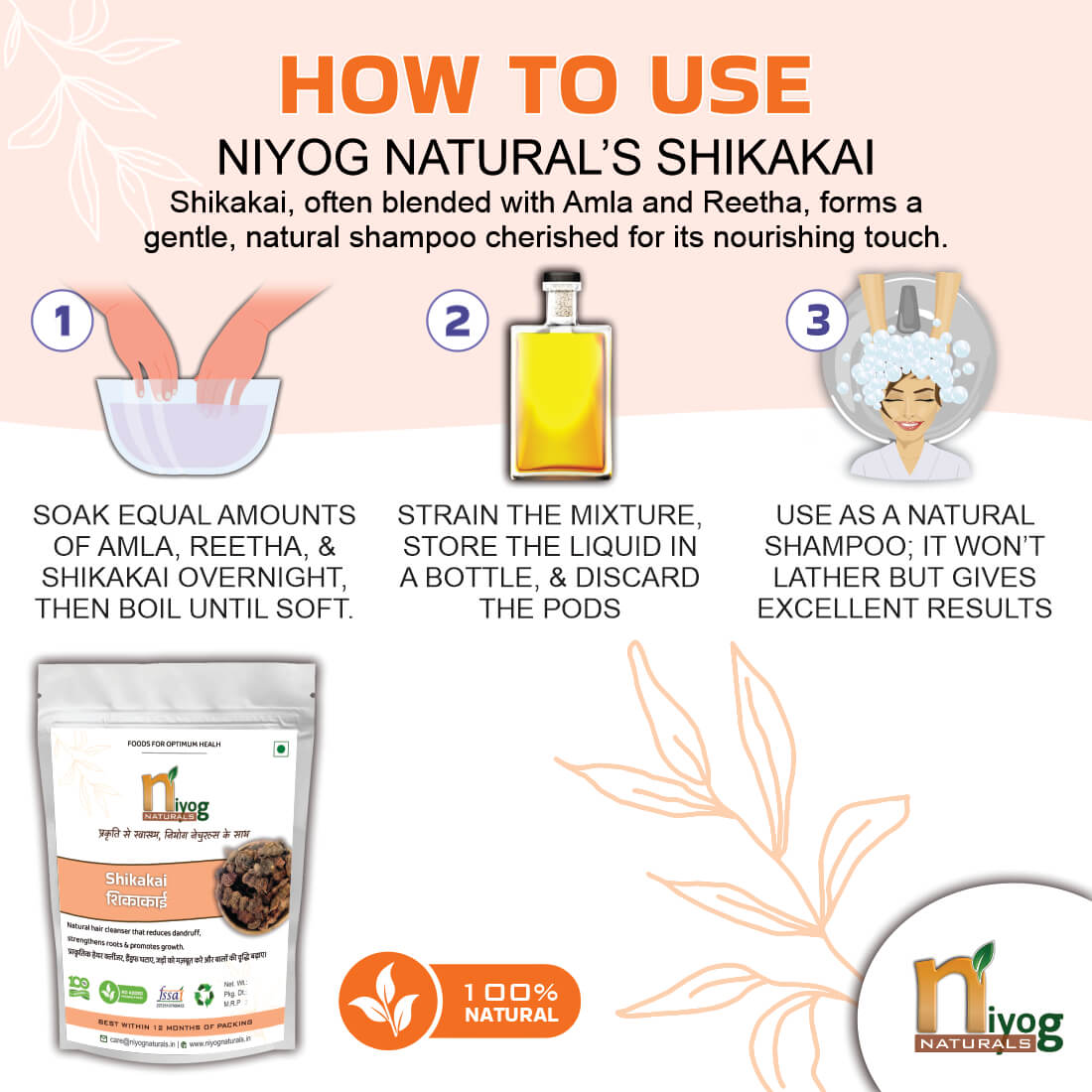 Mix Niyog Naturals Shikakai Powder with water or combine it with Amla and Reetha powders to make a nourishing hair pack or cleanser. Apply on scalp and hair, leave for 15–20 minutes, then rinse thoroughly.